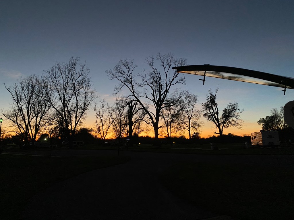Tip of the day: When looking for a campsite, take it seriously when they say ‘sites go fast’! We thought they meant people reserved spots months ago, and they might be hard to find last minute. We had no idea that a site you like would be there one minute and gone in a flash – over and over! That’s how we ended up in a spot that was almost too small for us. We just grabbed whatever was available. Which reminds me – I better get on finding something for tomorrow.\