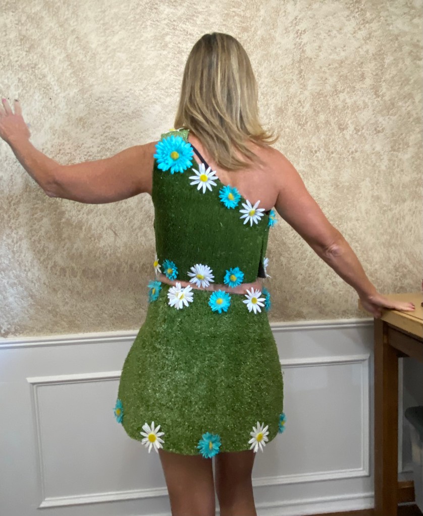 Remember that project Elaine did for me? Here’s the final result. She gets ALL the credit! All I did was model and glue on some flowers. Our theme night was ABC (Anything But Clothes) and my roommate MaryBeth (on the left) decided we needed to wear astroturf! Craziness, but it was extra fun when Canadian Olympian Chaim Schalk joined our party (he’s the super tall guy in the middle).