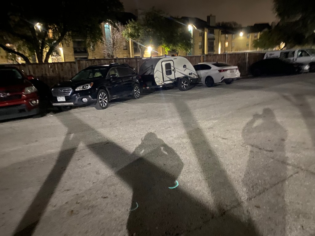 She’s a bit goofy, and if you knew everything going on in her world, you would understand, but she’s awesome! AND she bought dinner! What?! Too cool. She lives in an apartment in San Antonio, and never checked to see if I could park there for a night, so we took our chances. I did my best to fit into three spaces instead of my usual four by snuggling up close to her car in the front. There was plenty of parking spaces left, including three right behind my rig. Look what happened