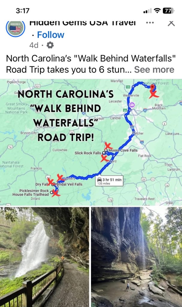 Elaine and I were talking before I started this leg of my trip, and we both came across the same North Carolina waterfall map